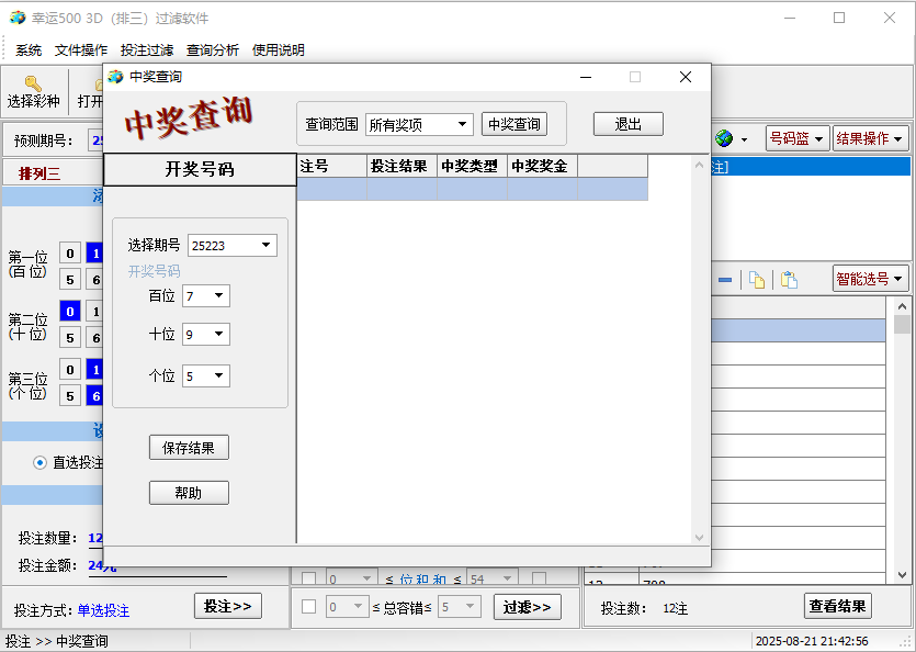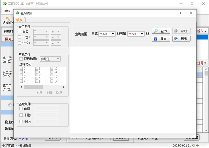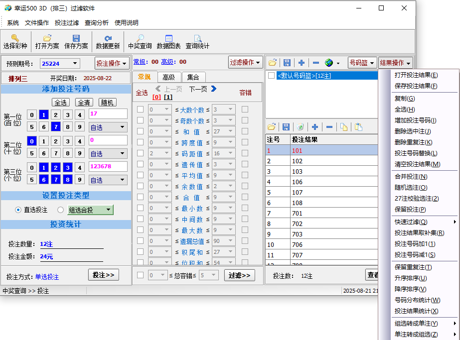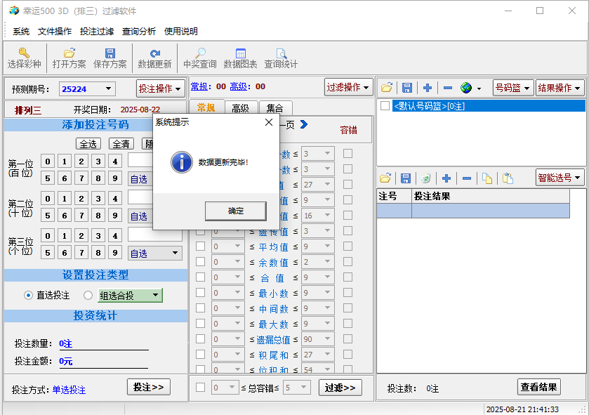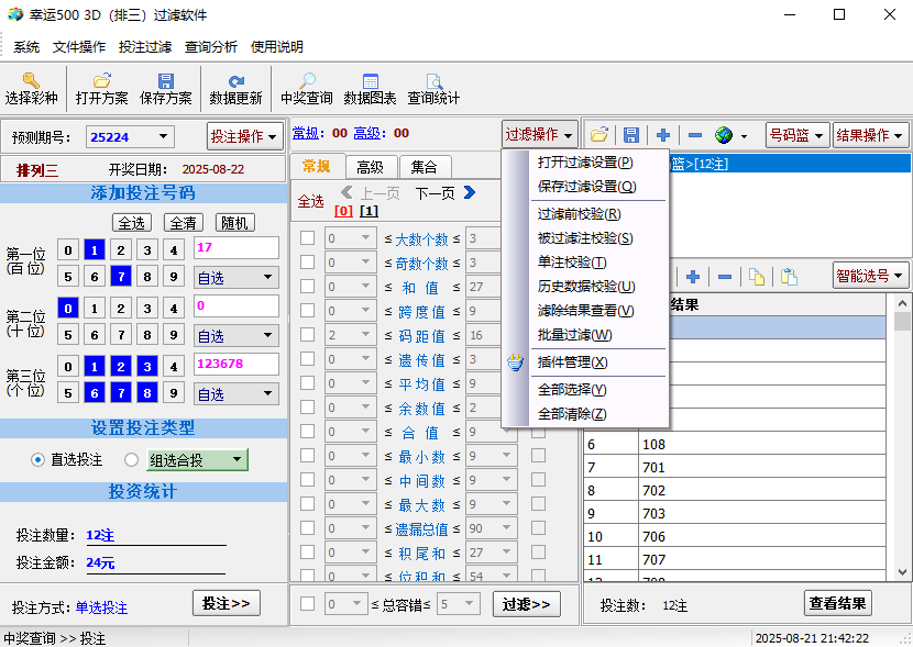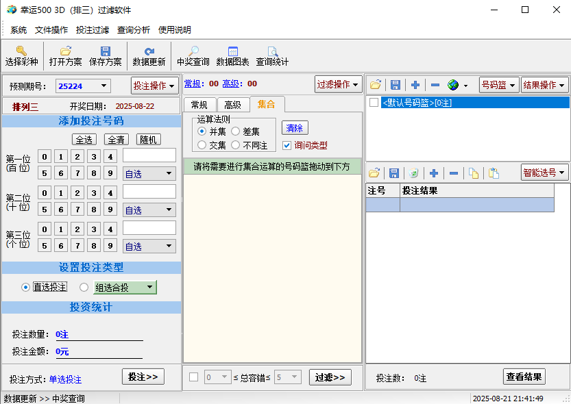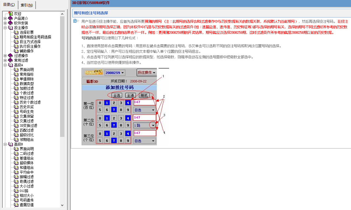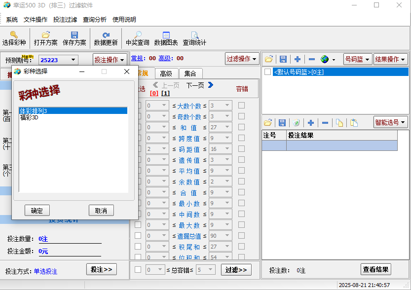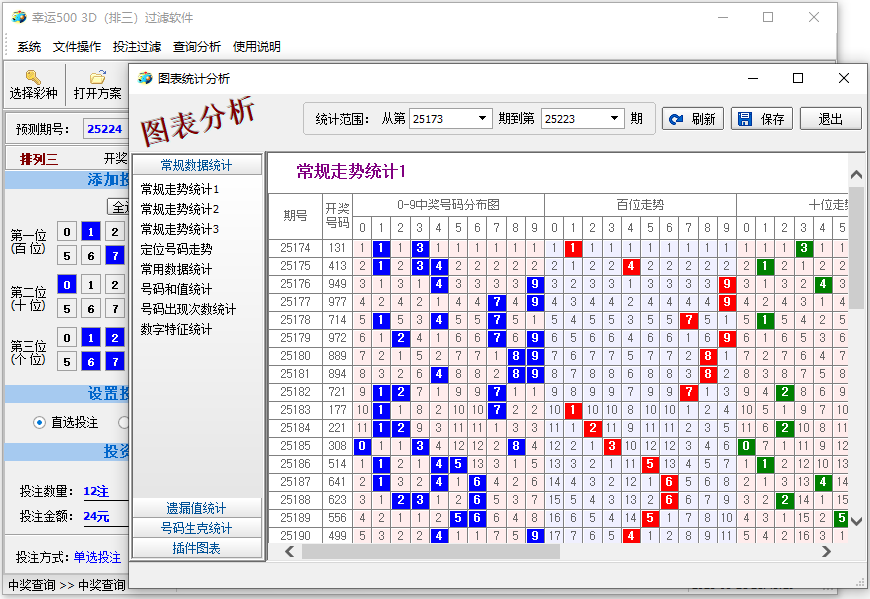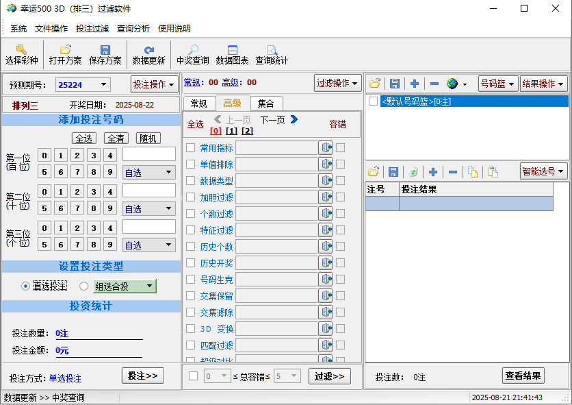 幸运500数字三(福彩3D,排列3)过滤软件运用应用数学中的覆盖设计原理、组合优化理论、信息经济学和概率统计学原理,通过多种常用过滤和高级过滤(号码和值、单值排除、类型过滤、加胆过滤、个数过滤、特征过滤、匹配过滤等等)以及各种类型走势图,可以对投注组合进行最大优化,大大减少了号码数量。