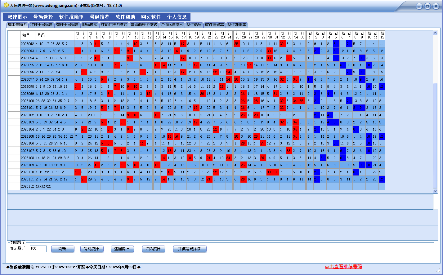 大乐透选号器软件综合目前网络上最热门的彩票分析方法,运用各种数学方法对彩票的历史开奖号码进行复杂的整理、统计、运算,得到更具分析性的数据(目前提供20余种红球规律和10余种蓝球规律),通过对近20种的过滤方法,最高比例的对投注组合进行优化,最大限度的减少了彩民的投注数量,最大限度的提高了彩民的中奖概率,是长期分析 大乐透彩票的最佳利器。如能长期坚持使用,大奖早晚会砸中您的脑袋。
