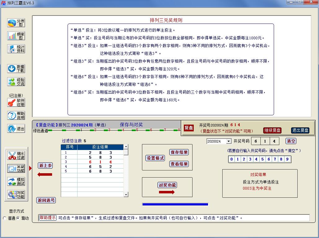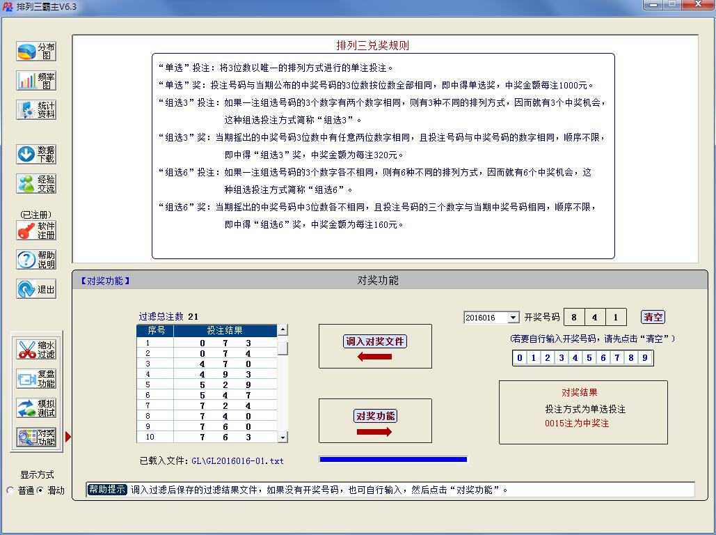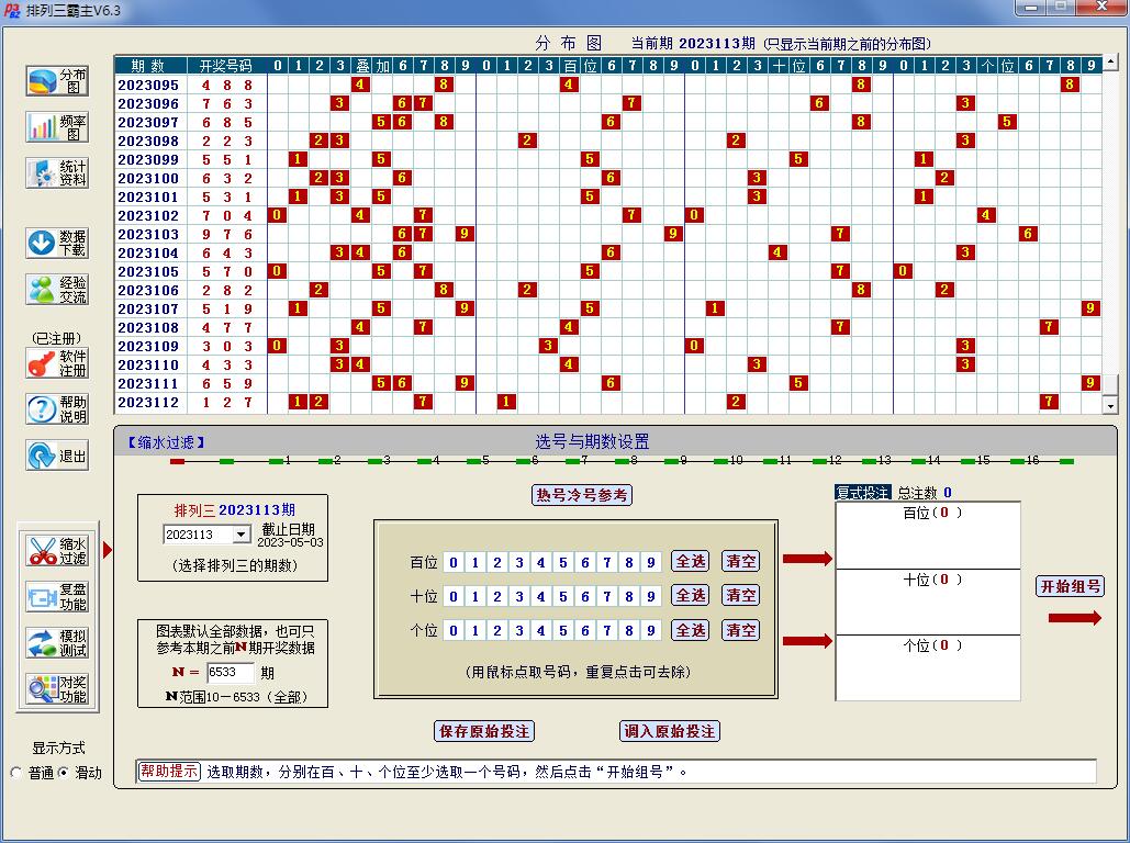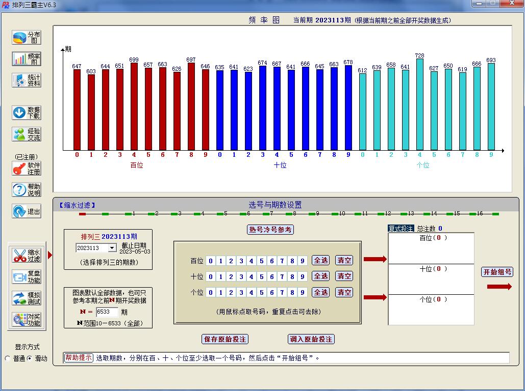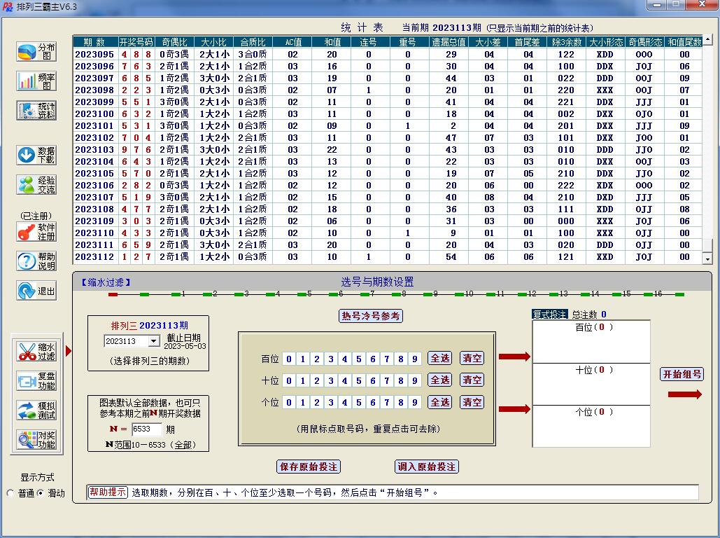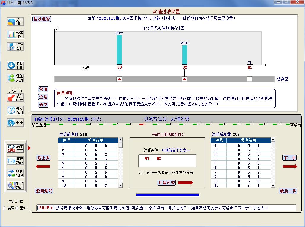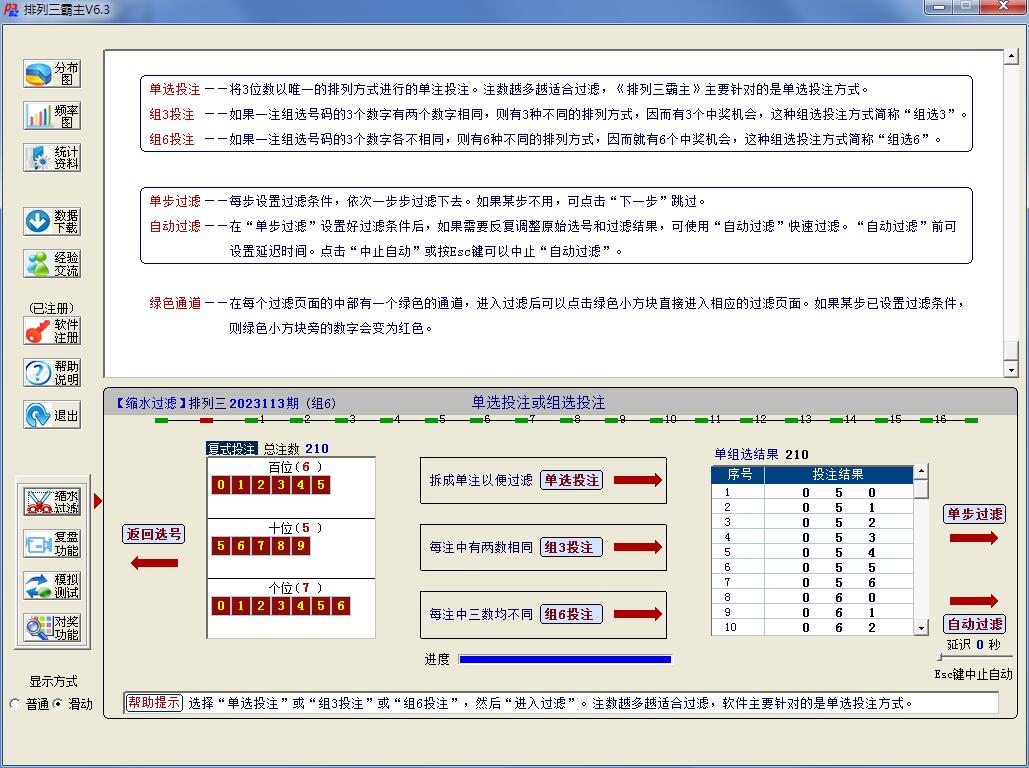 过滤是一把双刃剑,在过滤掉垃圾注的同时,也可能过滤掉奖项,因此对过滤方法的选择和设置当慎之又慎。把所有的方法都混杂在一起过滤,是对自己资金的不负责任,使每种过滤方法的效果都很盲目,也不便于设置,而《排列三霸主》采用独特的流水线结构,将经过反复验证、最有效、最稳定的十六种过滤方法,以流水线的模式固定下来,每种方法都配有相应的规律统计图,这样可以放大和聚焦每一种过滤方法,既方便对过滤方法的设置,也方便对每种过滤方法效果的评估。