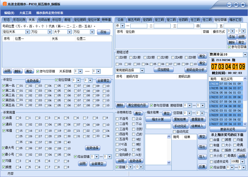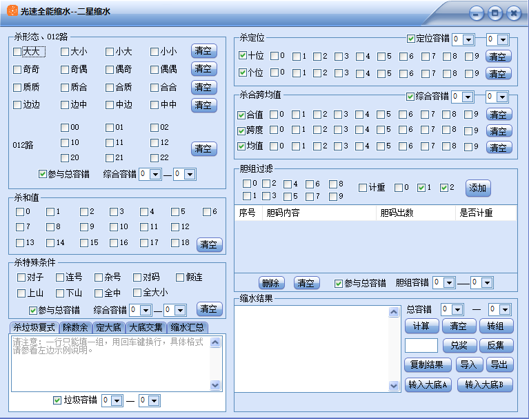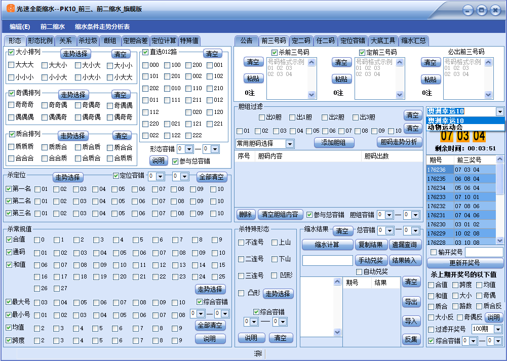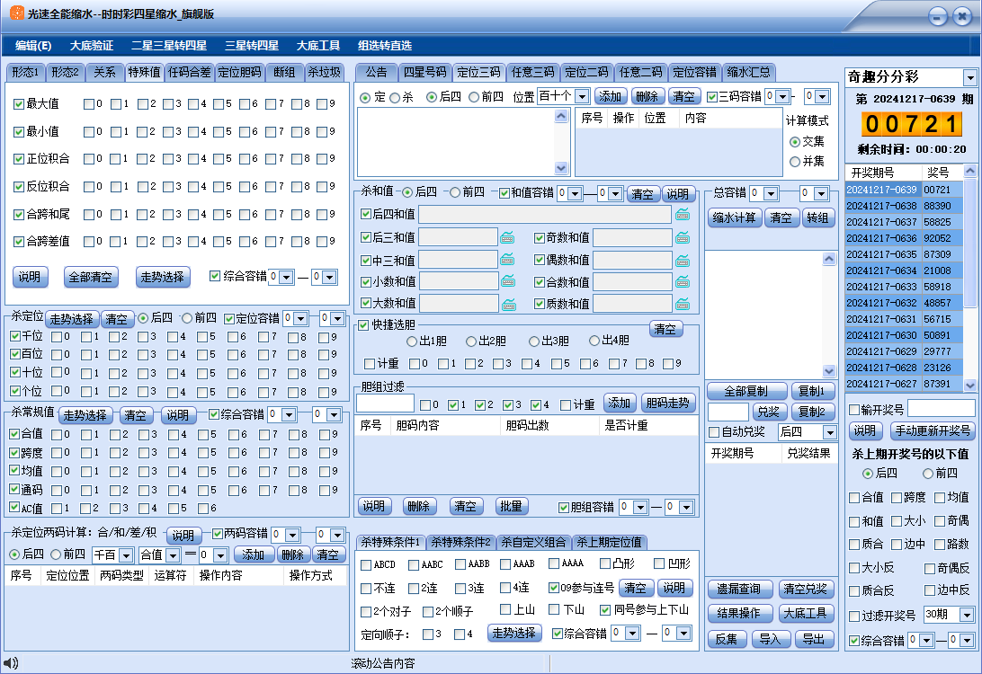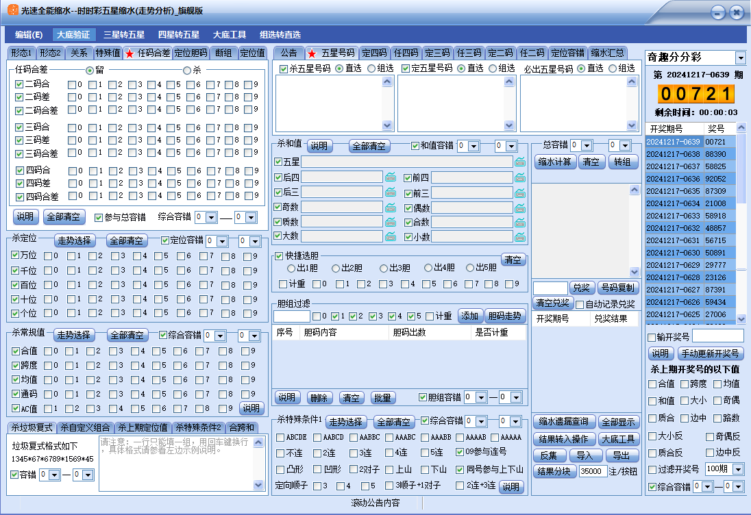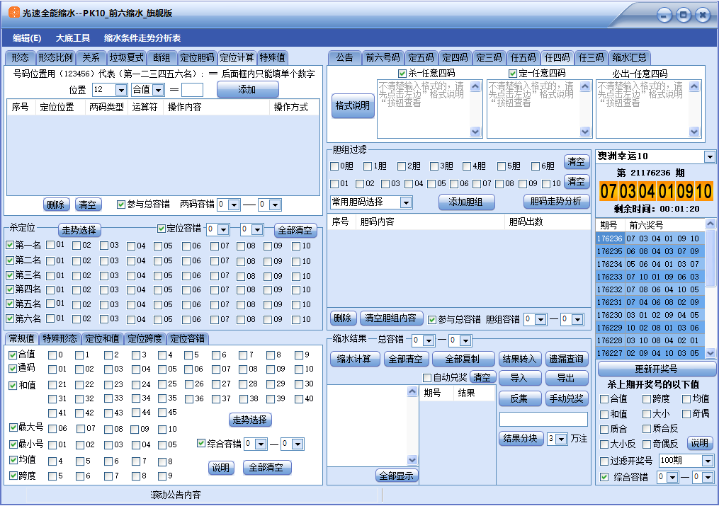 光速全能缩水软件旗舰版是在专业版的功能上集成走势分析功能,包括几乎所有缩水条件的:遗漏次数、冷热次数,遗漏走势图,冷热走势图,缩水条件号码分布走势图,胆码冷、温、热 号码走势选择,胆码的(中奖率百分比、最大连挂次数、连中次数,当前连挂次数、连中次数、扫描结果排序显示)等条件的综合遗漏扫描,最大支持最近1000期开奖号码进行遗漏扫描分析。是做胆,选胆的必备分析工具。缩水做号、选号、走势分析、真正做到快捷方便,不再需要看第三方走势网站和软件了......