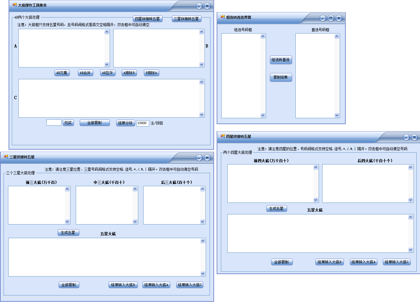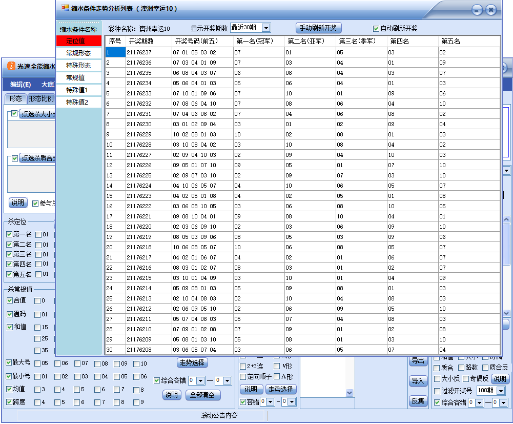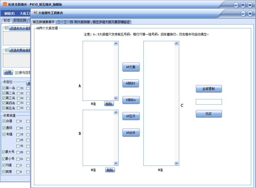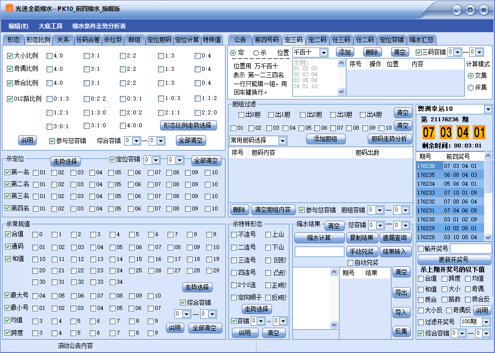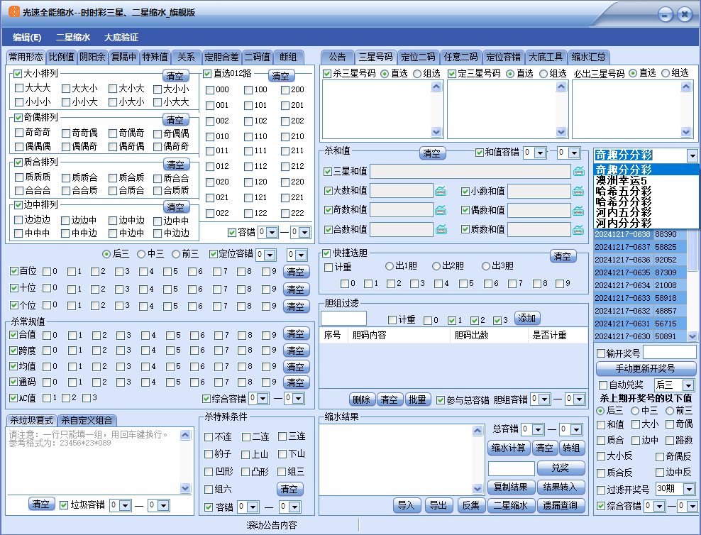 光速全能缩水软件旗舰版是在专业版的功能上集成走势分析功能,包括几乎所有缩水条件的:遗漏次数、冷热次数,遗漏走势图,冷热走势图,缩水条件号码分布走势图,胆码冷、温、热 号码走势选择,胆码的(中奖率百分比、最大连挂次数、连中次数,当前连挂次数、连中次数、扫描结果排序显示)等条件的综合遗漏扫描,最大支持最近1000期开奖号码进行遗漏扫描分析。是做胆,选胆的必备分析工具。缩水做号、选号、走势分析、真正做到快捷方便,不再需要看第三方走势网站和软件了......