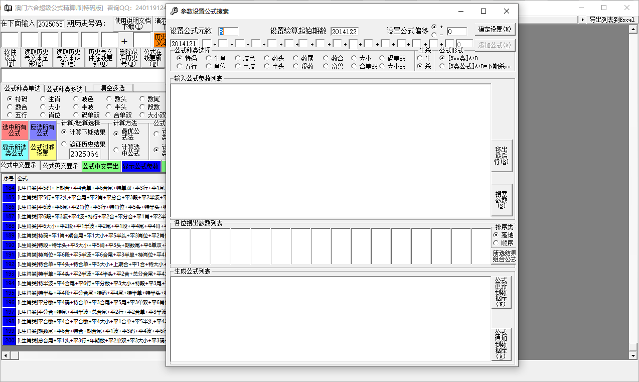 包括特码公式精算师、平特公式精算师、平码公式精算师和平位公式精算师4种软件,可以计算码、肖、波、头、尾、门(段)、(五)行、单双、大小等16种参数